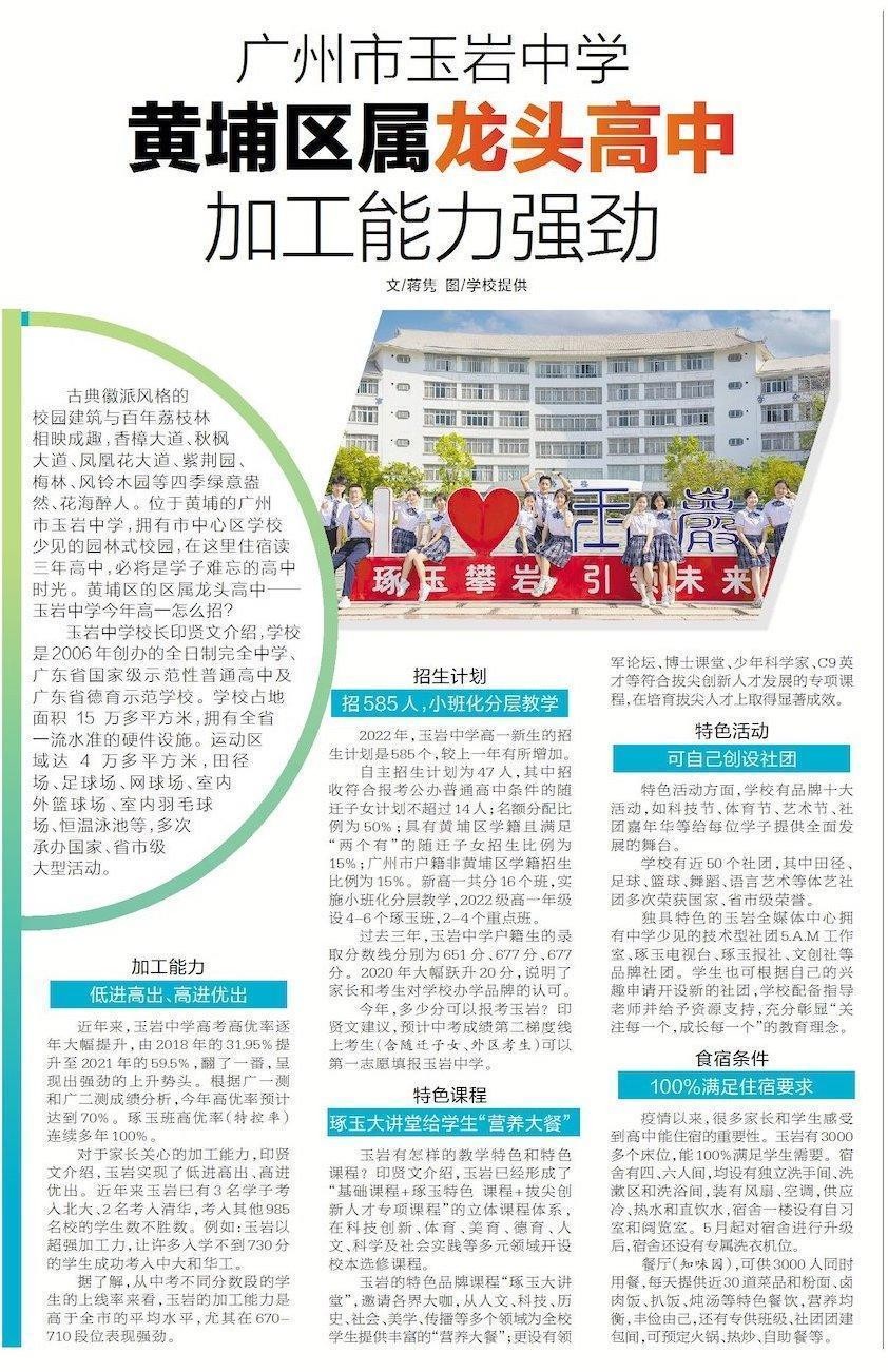 广州市玉岩中学:黄埔区属龙头高中加工能力强劲