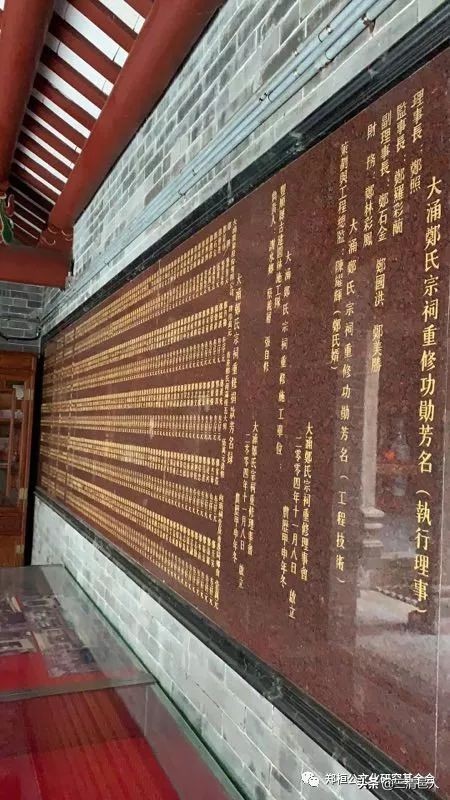 祠堂的石壁上用金字镌刻着修建祠堂的来龙去脉,当然也镌刻着修建祠堂时,各地郑氏后裔踊跃捐款捐物的记录,这些文字让所有郑氏后人记住他们的先辈为传承保护郑氏宗祠而做出的努力,更能激励着一代又一代郑氏后人铭记先辈敬祖敬宗不忘本的精神。