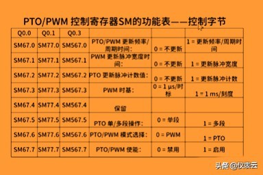 我们的步进电机就这样定位,根据发脉冲的多少来决定走到哪里,PTO这就是我们步进和伺服定位的基础。该怎么设定呢?接下来我们看一下这张表格。大家看一下标题,PTO/PWM控制寄存器SM的功能表,后面写了一个控制字节。