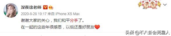 2020年8月,徐老师发文称,两人已经和平分手,没有告诉具体的原因,但是徐老师文末还称两人以后还是好朋友。