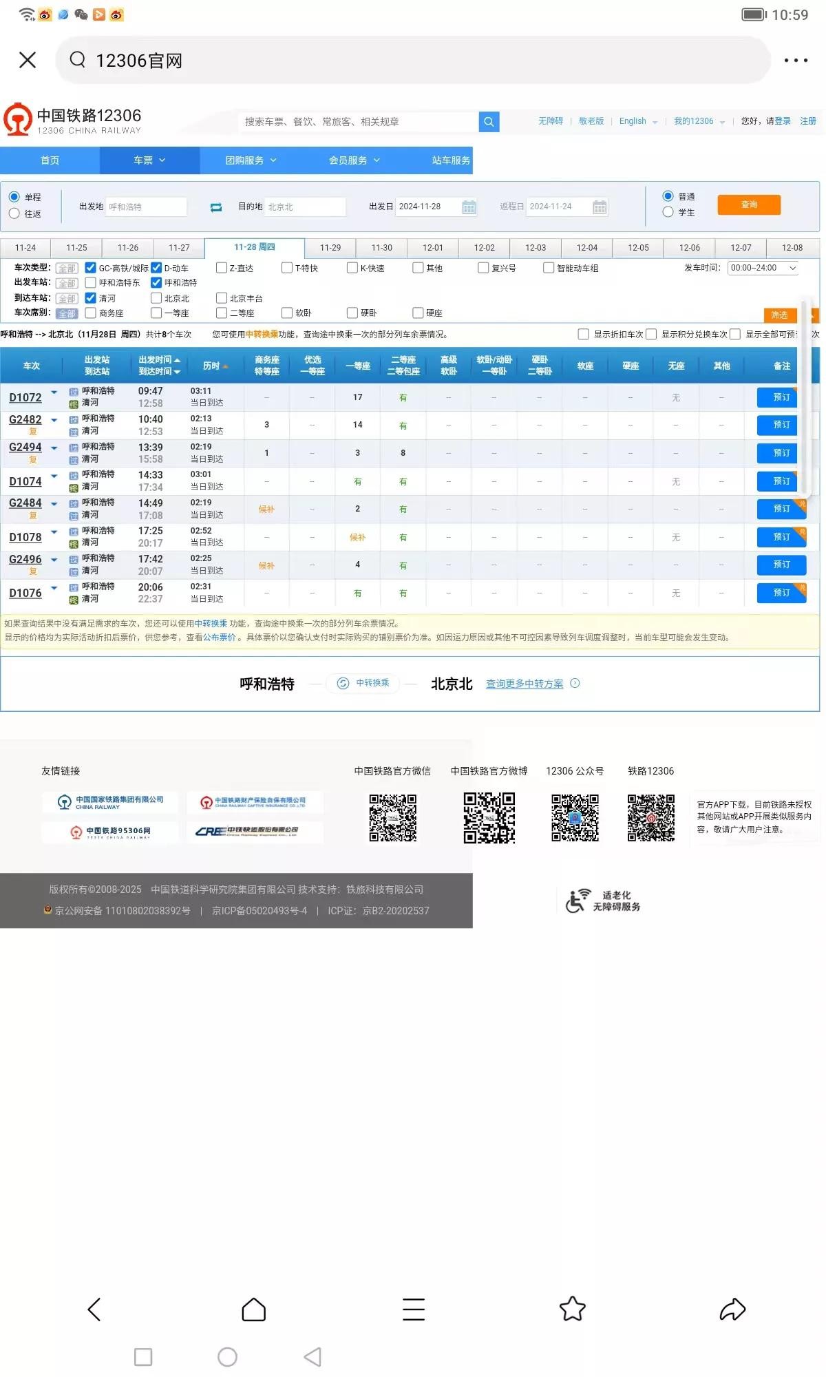 呼和浩特东至北京北列车(12个车次)