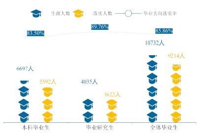截至2023年8月31日,毕业生总人数为10732人,毕业去向落实人数为9214人,初次毕业去向落实率为85.86%,其中,本科毕业生毕业去向落实人数为5592人,毕业去向落实率为83.50%、毕业研究生毕业去向落实人数为3622人,毕业去向落实率为89.76%。