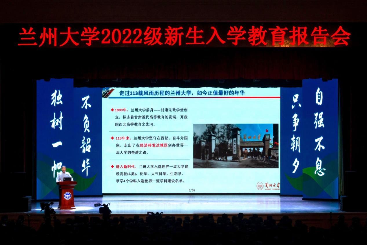 “一条河:黄河;一碗面:牛肉面;一本书:读者;一本证:骆驼驾驶证。兰州是古丝绸之路上中外经济文化交流的重要通道,今天又成为丝绸之路经济带的核心节点城市。113年来兰州大学坚守在西部、奋斗为国家,走出了在经济待发达地区创办世界一流大学的奋进之路。”严纯华首先从地域文化、办学历史、学科建设、师资力量、四季风景、校园美食、未来愿景等方面对兰州大学进行介绍。他表示,深厚的办学积淀、良好的教学设施、踏实的学习氛围、适宜的气候等都为同学们提供了充足的成长空间,希望大家与未来可期的兰州大学一起成长,成为学校的建设者,携手将兰州大学从一所好大学发展为一所伟大的大学,进而成为典雅的大学。