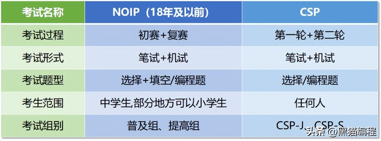 CSP-J/S分第一轮和第二轮两个阶段第一轮考察通用和实用的计算机科学知识,以笔试为主,部分省市以机试方式认证;第二轮为程序设计,须在计算机上调试完成;第一轮认证成绩优异者进入第二轮认证;第二轮认证结束后,CCF将根据CSP-J/S各组的认证成绩和给定的分数线,颁发认证证书。19年后NOIP只有一轮考试:题型为编程题。CSP是付费赛事,NOIP和NOI是免费赛事(NOI是教育部的白名单赛事)