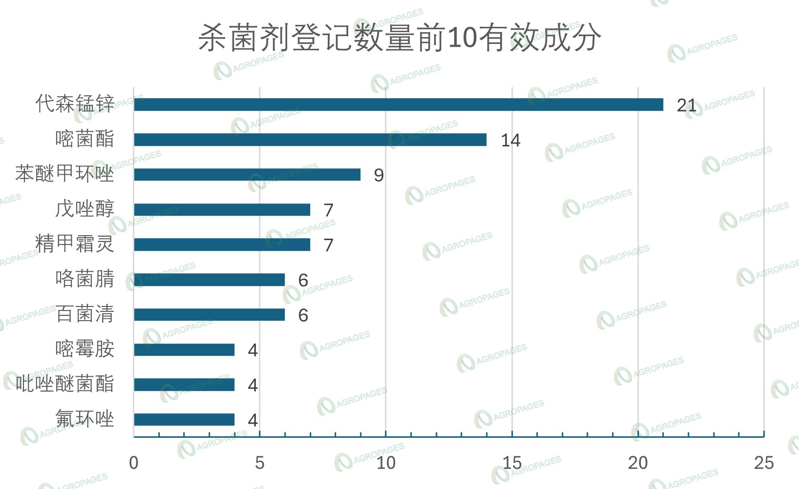 具体来看,杀菌剂有效成分排行前10的有效成分,共涉及82个登记证产品,占比15.50%。其中,代森锰锌第一,涉及产品数量21个,占比3.97%;嘧菌酯第二,涉及产品数量14个,占比2.65%;苯醚甲环唑第三,涉及产品数量9个,占比1.70%;戊唑醇和精甲霜灵第四,涉及产品数量7个,占比1.32%;咯菌腈和百菌清第五,涉及产品数量6个,占比1.13%;氟环唑、吡唑醚菌酯和嘧霉胺第六,涉及产品数量4个,占比0.76%。