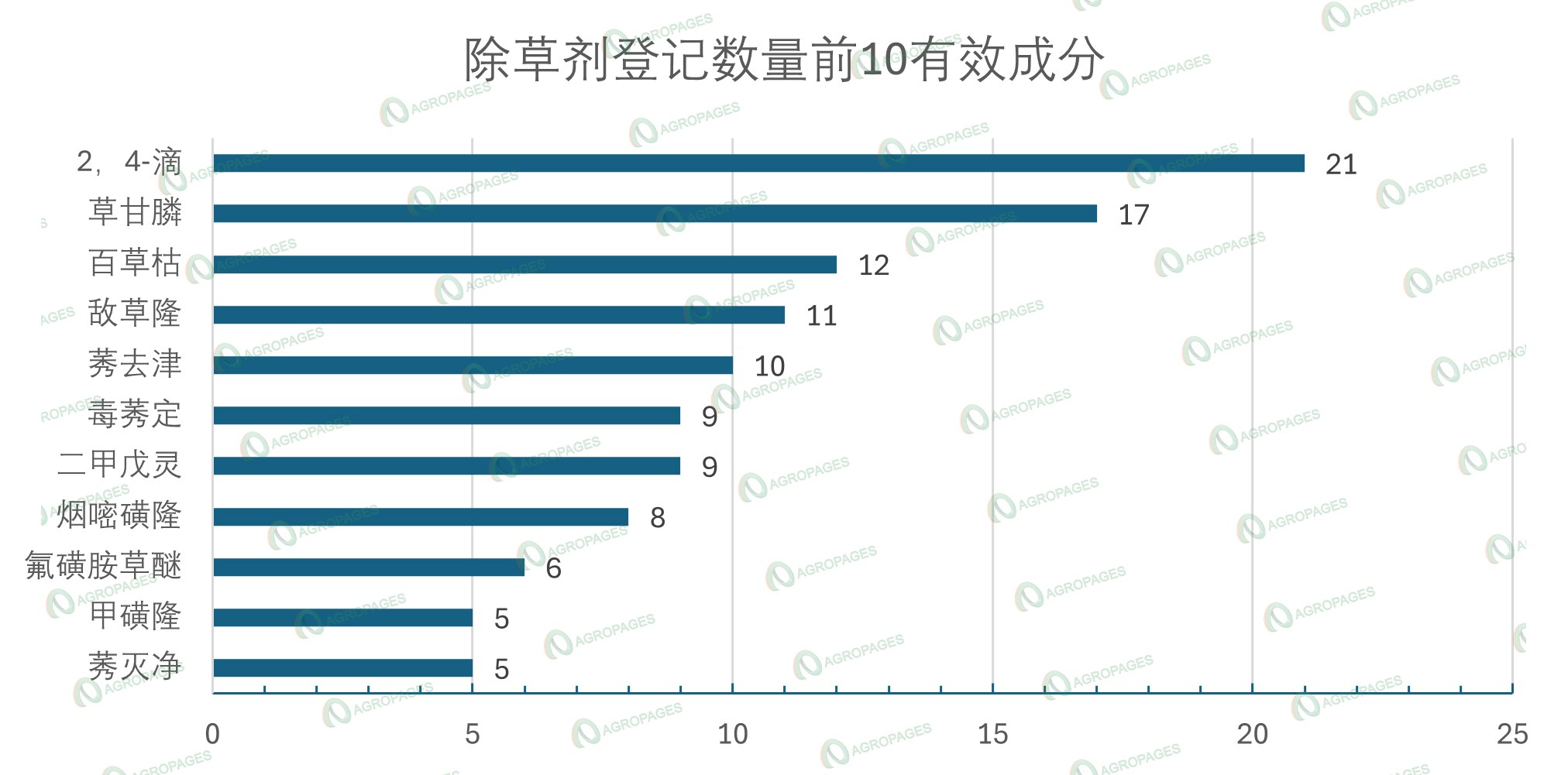 具体来看,除草剂有效成分排行前10的有效成分,共涉及113个登记证产品,占比21.36%。其中,2,4-滴第一,涉及产品数量21个,占比3.97%;草甘膦第二,涉及产品数量17个,占比3.21%;百草枯第三,涉及产品数量12个,占比2.27%;敌草隆第四,涉及产品数量11个,占比2.08%;莠去津第五,涉及产品数量10个,占比1.89;毒莠定和二甲戊灵第六,涉及产品数量9个,占比1.70;烟嘧磺隆第七,涉及产品数量8个,占比1.51;氟磺胺草醚第八,涉及产品数量6个,占比1.13;甲磺隆和莠灭净第九,涉及产品数量5个,占比0.95%.