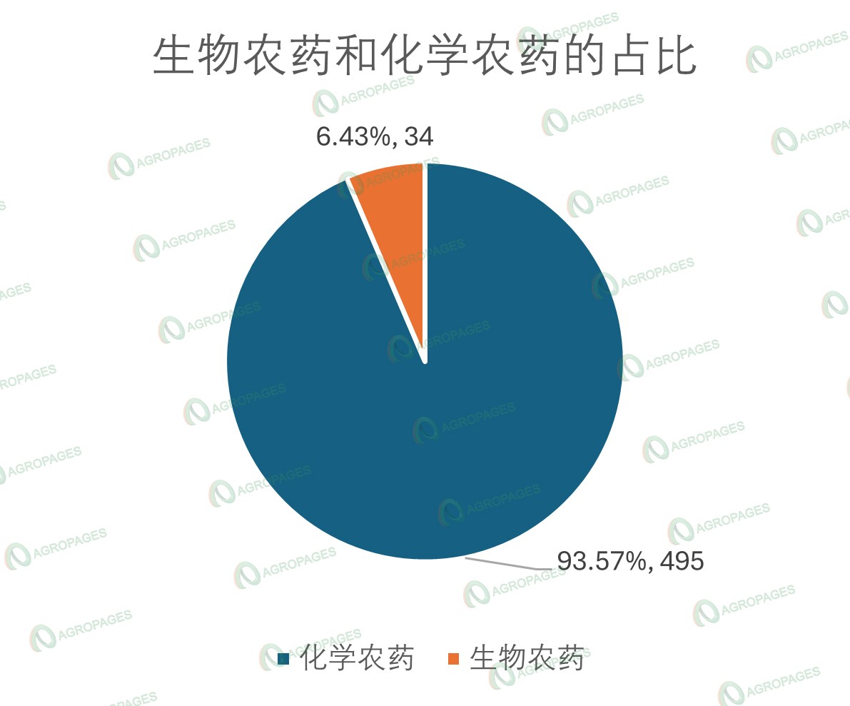 从农药产品的分类来看,传统的杀菌剂、杀虫剂和除草剂占据主要市场,共涉及450个登记证。其中,杀虫剂以159个登记证位列第一,占比33.84%;除草剂以159个登记证排名第二,占比30.06%;杀菌剂则仅有112个登记证位列第三,占比21.17%。三大常规化学产品占比超过85%的占比,说明传统农药产品依旧占据市场主流。