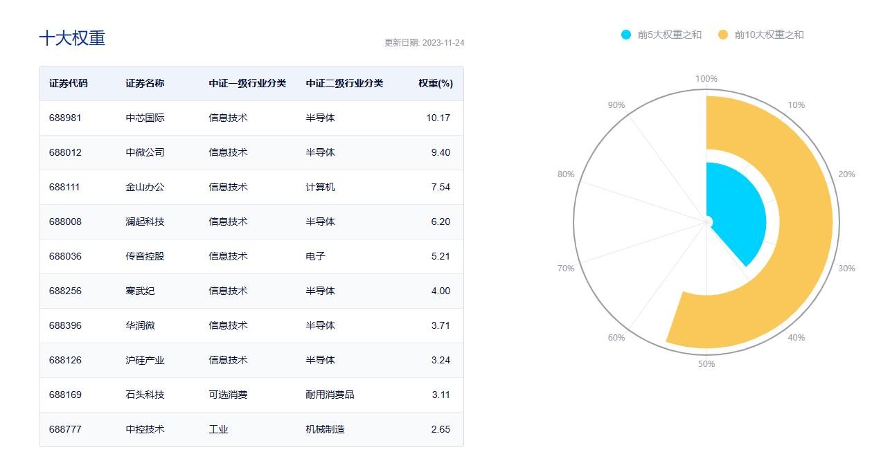 科创信息技术ETF(588100)跟踪上证科创板新一代信息技术指数,该指数从科创板市场中选取50家市值较大的下一代信息网络、电子核心、新兴软件和新型信息技术服务、互联网与云计算、大数据服务、人工智能等领域上市公司证券作为指数样本;指数前十大权重股包括中芯国际、中微公司、金山办公等,其权重合计占比超50%。(资料来源:中证指数官网,截至2023.11.24)