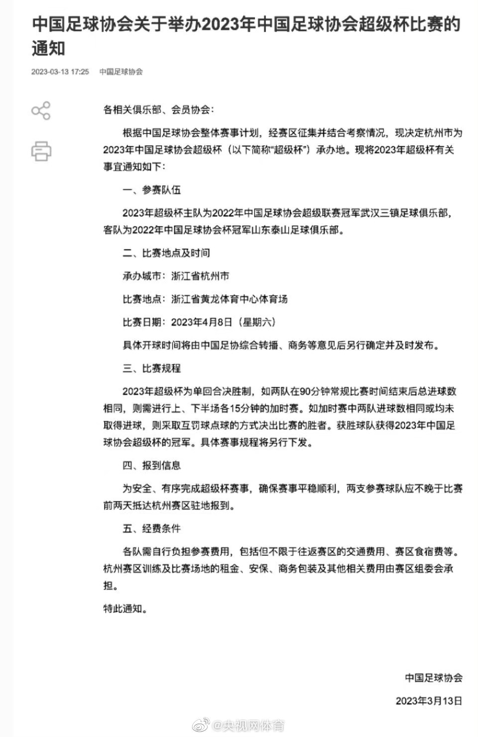 据央视网体育报道,北京时间3月13日,中国足协官方发布公告,2023年超级杯将于4月8日在浙江省黄龙体育中心体育场进行,对阵双方为2022年中超冠军武汉三镇与2022年足协杯冠军山东泰山。