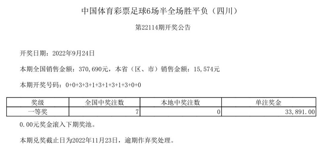 中国体育彩票足球胜平负(四川)第22114期全国销售60376018元。开奖号码:3+0+3+0+1+0+3+3+3+3+1+3+3+0。