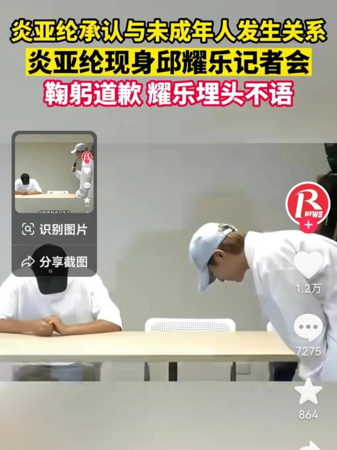炎亚纶现身邱耀乐记者会,在记者会上炎亚纶态度诚恳的鞠躬道歉,在表示对不起对方的同时,还表达了事情发展成这样,让邱耀乐承受了本不应该承受的事情,表示愧疚。