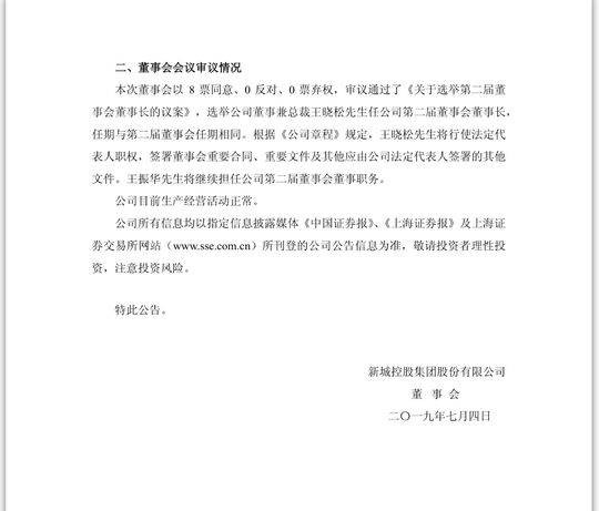 7月3日晚间,新城控股发布公告,公司于7月3日接到上海市公安局普陀分局通知,公司实际控制人、董事长王振华因个人原因被刑事拘留,公司于7月3日召开第二届董事会第十六次会议。本次董事会以8票同意、0反对、0票弃权,审议通过了《关于选举第二届董事会董事长的议案》,选举公司董事兼总裁王晓松任公司第二届董事会董事长,任期与第二届董事会任期相同。