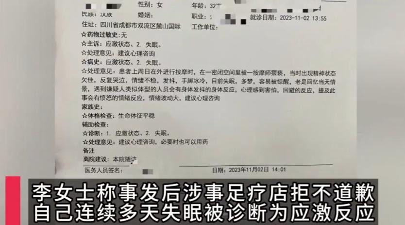 11月5日,记者联系了涉事足疗店,店长表示相信技师不会猥亵客人。李女士则表示,涉事足疗店拒不道歉,自己因此事已连续多天失眠,被诊断为应激反应。