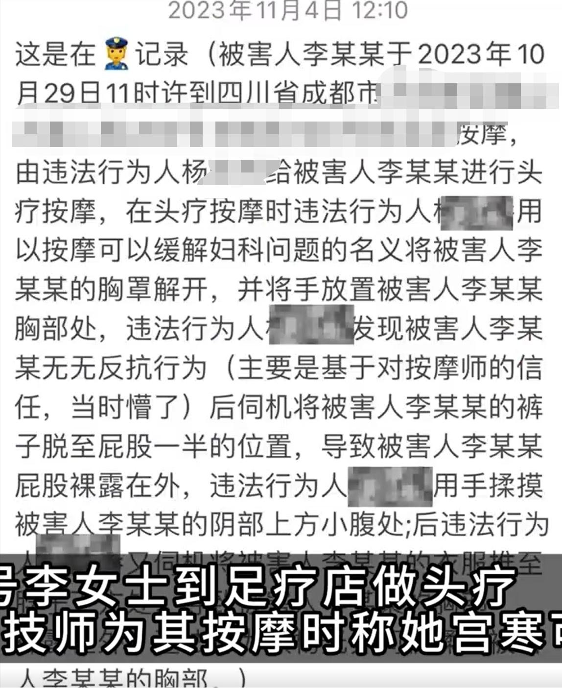 据报道,10月29日,四川成都的李女士(化名)在某足疗店做头部按摩,男技师以她身体不好和帮她调理宫寒为名,未经同意将其内衣解开,并触摸其私密部位。