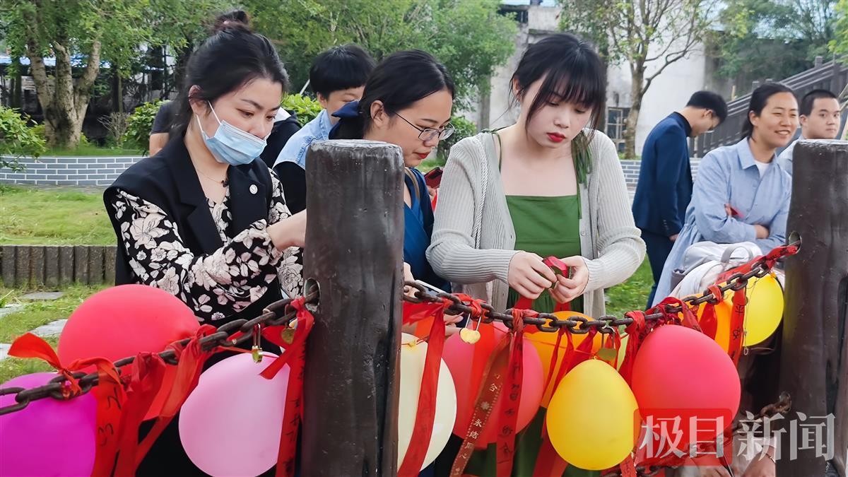 “祝家人健康”“祝早日脱单”……“姻缘树”下,青年男女们将自己的心愿写在红绸上,然后系在姻缘树下,一条条洋溢青春气息的祝福语表达了大家对幸福生活的期许,同时也表达出对美好姻缘的憧憬。