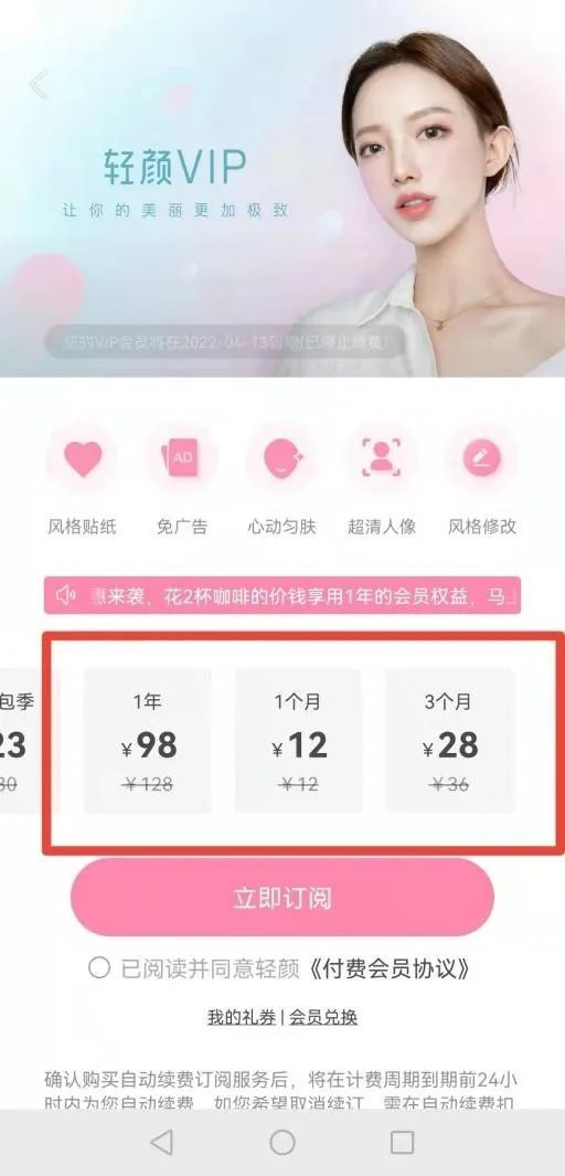 一是自动续费选项外,难寻其他选项。比如,在“轻颜”相机APP会员充值页面中,首先映入眼帘的就是连续包年、连续包季、连续包月的套餐,如果消费者不仔细查看,根本无法找到开通单月或单季的选项入口。细看之下才会发现,价格方框是可以左右滑动的,只有滑动了,才能显示所有的价目类别。