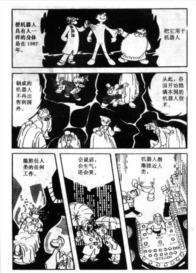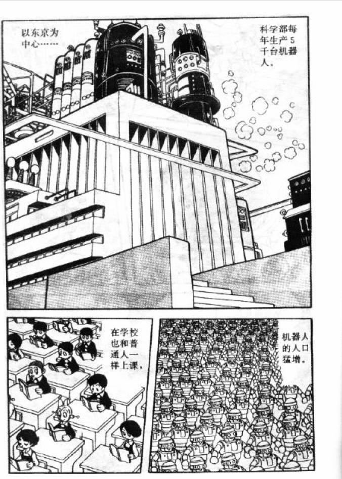 到了21世纪(漫画创作于20世纪50年代),机器人已经全面融入到人类社会中,并参与人类的一切社会活动。包括像普通人一样在学校上课、一样社交工作、一样受到法律的约束。