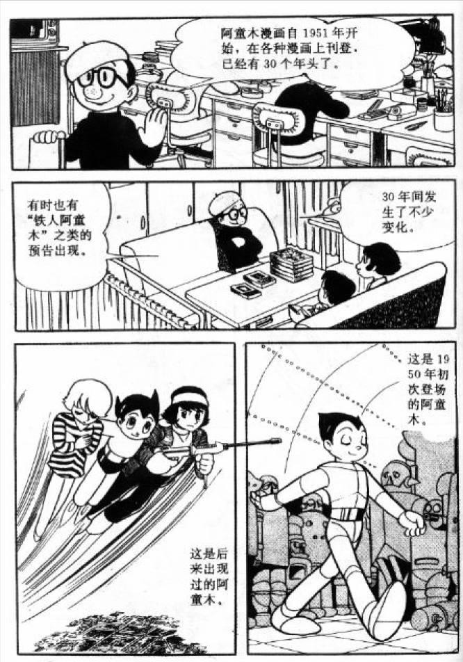 至于手冢治虫创作的“阿童木漫画”,如今已变成了一个比较复杂的系列。目前手冢治虫笔下的阿童木漫画作品主要包括《铁臂阿童木》、《阿童木今昔物语》、《阿童木别卷》、《阿童木诞生》等多部内容。