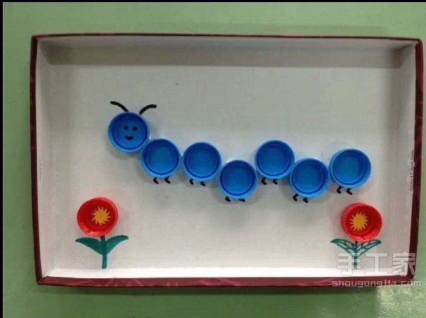 这个是老师最喜欢的环保作品了。 用了两种颜色的瓶盖做出来的毛毛虫。