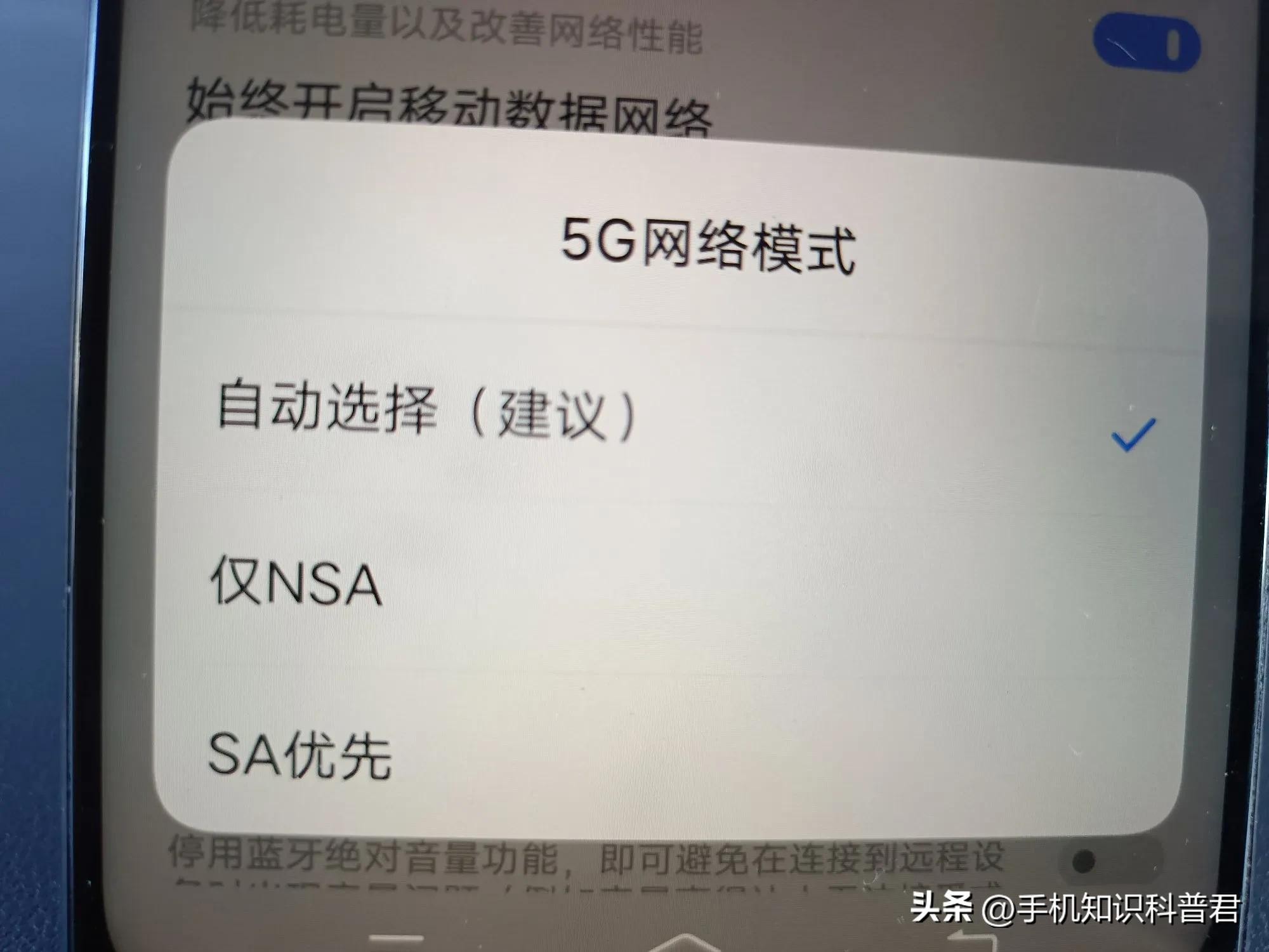 这里有三种模式:自动选择、仅 NSA、SA 优先,(如上图所示)