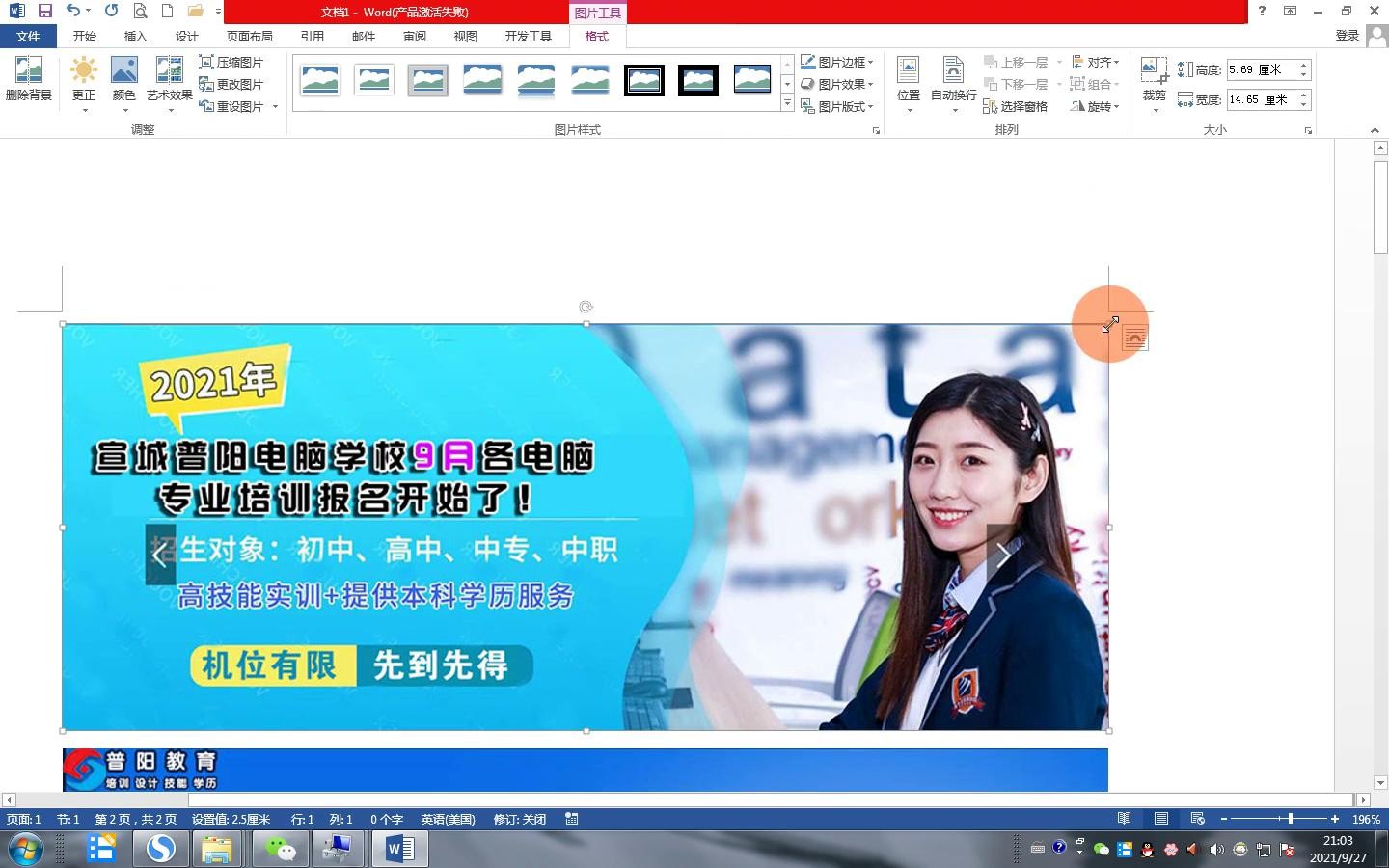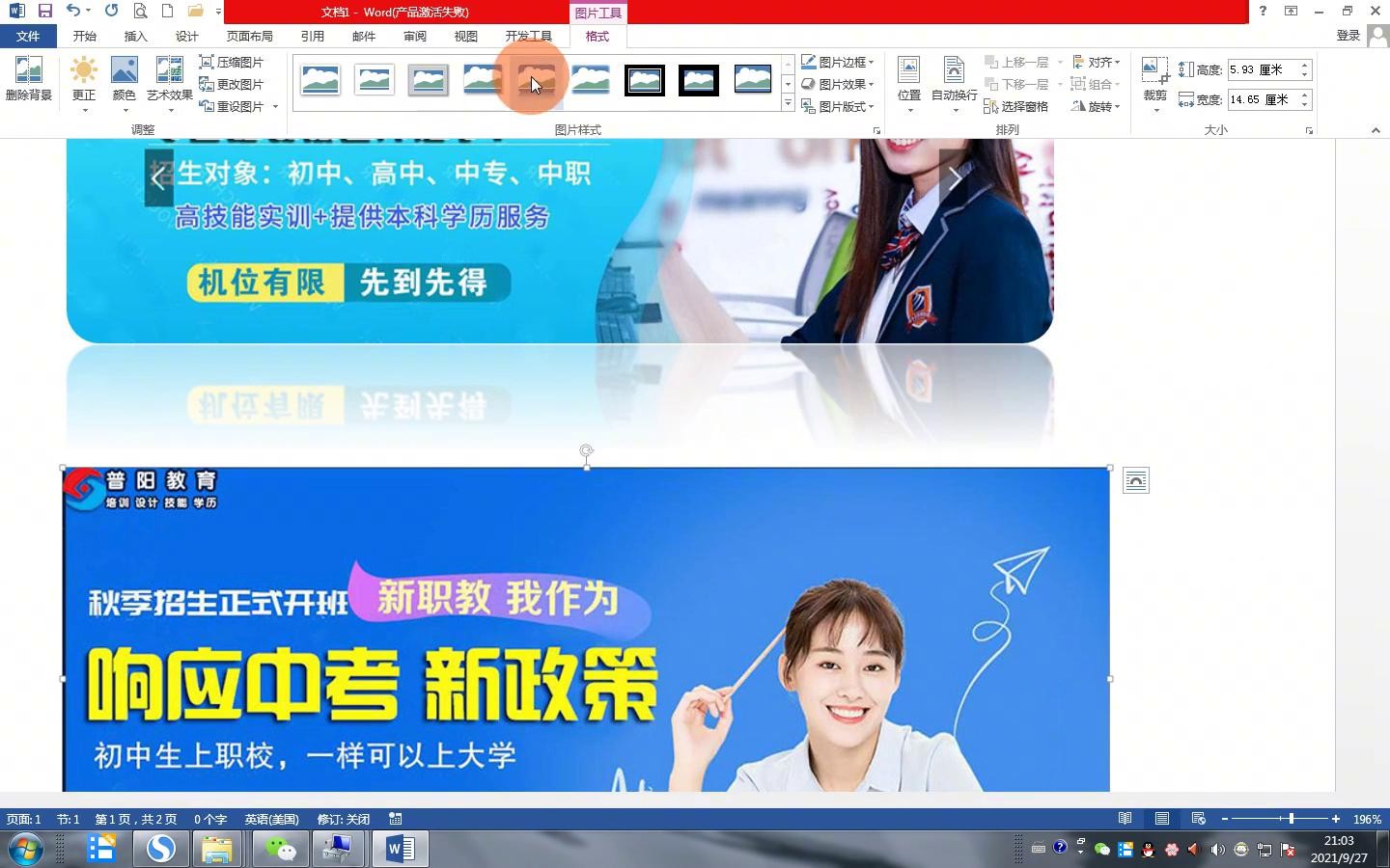 ·第三步,对word文档进行调整,比如图片太大了,缩小,图片可以缩小,但如果近距离缩小可以直接这里面也可以加文字特效或者图片特效,圆角画非常方便,圆角加黑色的图框等等,非常傻瓜的,都可以做,倒角好看一点。