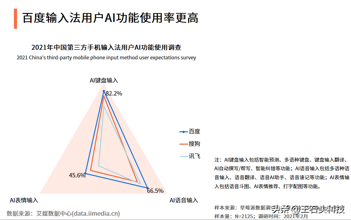 百度输入法的渗透率明显高于搜狗和讯飞,AI键盘输入、AI语音输入和AI表情输入分别达到了82.2%、66.5%和45.6%。