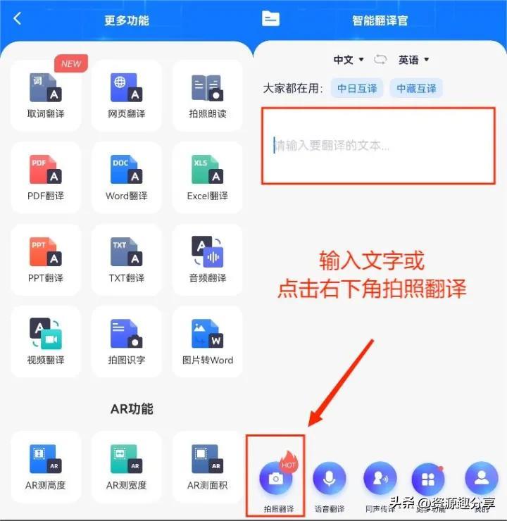 可以手动输入需要翻译的文本,或者点击右下角的拍照翻译,不仅是拍照翻译,还能图片转Word、PPT翻译、网页翻译、Word翻译等等。