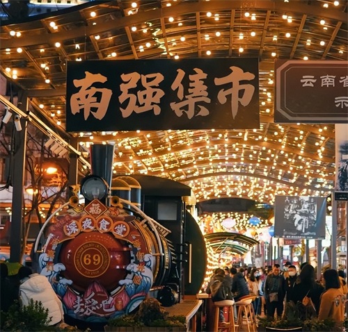 南强街夜市作为昆明市中心最热闹的夜市之一,汇聚了云南各州市的有名小吃、东南亚美食,还有传统民俗手工艺品、传统服饰、生活用品等。晚上,这里还会有街头艺人表演,引游人驻足围观。