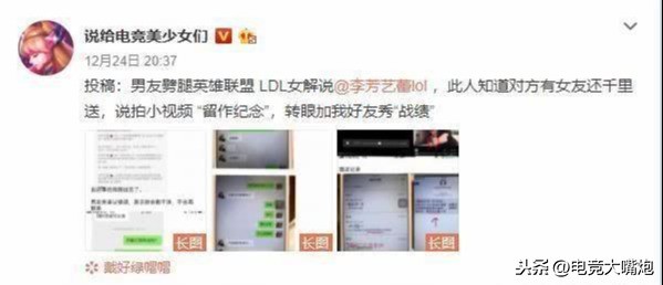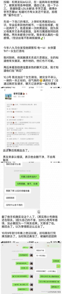 当然更狗血的绝不是靠当“上分B”这事儿,毕竟在LOL圈,许多女玩家想要靠上分着实困难,最让人难以置信的是她以往在情感方面的黑历史,爆料者宣称,被劈腿女方是在上学时和男友在LOL里相识,之后就搬到了男方城市,对于女方来说,这是她的第一次恋爱,因此格外珍惜这个男人,但后来却发现男友和一个叫做“女侠蕾(李芳艺蕾)”的ID经常打LOL,随后发现男友和这人更多聊天记录,才知道两人在“网恋”。