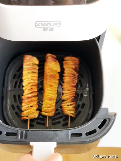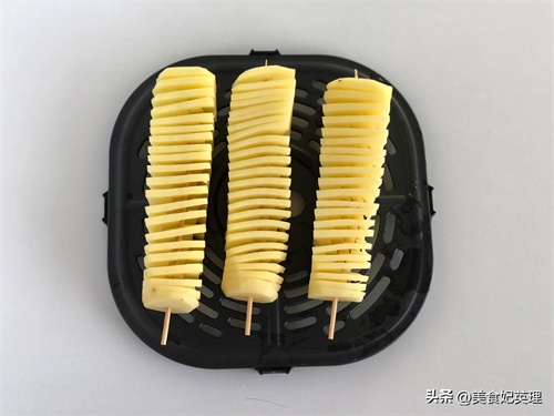 4.用竹签将土豆穿起来,轻轻拉长,摆入空气炸锅中