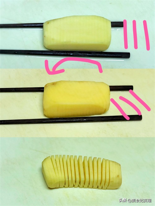 2.长方形土豆放在两根筷子中间,先竖着切,厚度大约2毫米,然后头尾对调翻个面,按照中间那张图左上右下的方向斜着切,同样的厚度,切完拉开就是土豆弹簧拉~