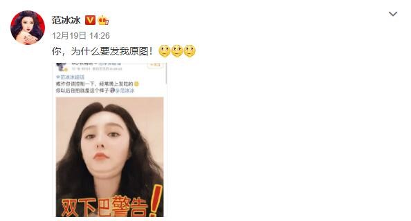 12月19日心情不错的范冰冰晒出了一张粉丝制作的搞笑照,照片中的她还有了很严重的双下巴,看上去非常的辣眼睛。