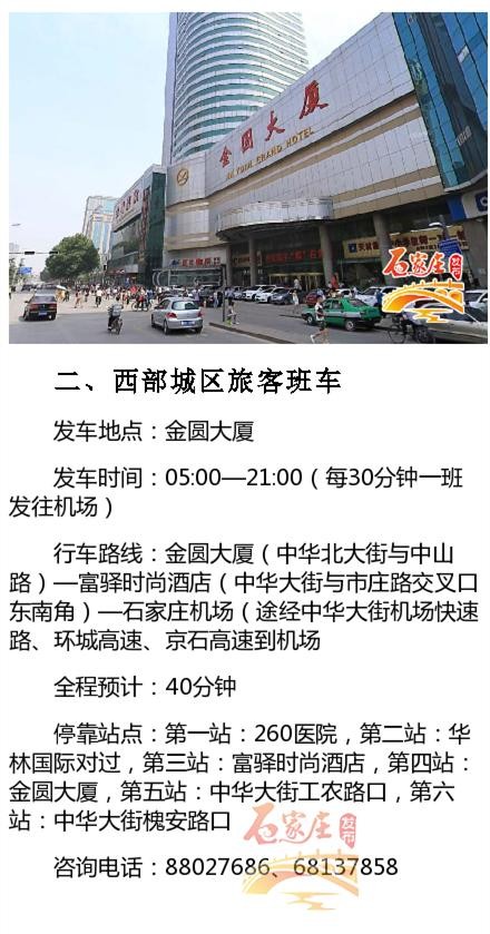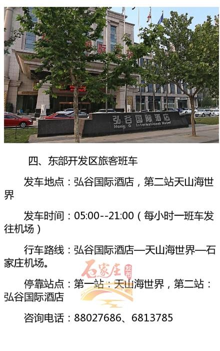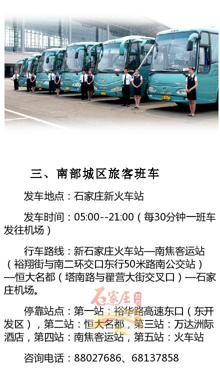 温馨提示:市区到石家庄机场的旅客班车不对应航班起飞时刻,自早上5:00-晚21:00整点和半点发车,每半小时一班,班车由市区至机场正常的运行时间约为50分钟,因交通堵车或其它不可抗拒的原因造成误机,公司不承担责任,为了不耽误出行,建议在航班起飞前90分钟到达机场。旅客随身的行李物品(小件行李可放在行李专座上),贵重物品随身携带,如大件行李上车需根据司机提示放置于班车行李箱内,下车时凭行李条提取。
