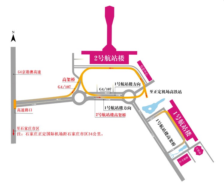 石家庄国际机场位于正定县,于1995年2月18日正式开航,为国内4E级干线机场,距石家庄市区约34公里,京港澳高速、107国道、京石高铁连接市区,交通便利。机场现有两座航站楼,1号航站楼运营国际、地区航班,2号航站楼运营国内航班。