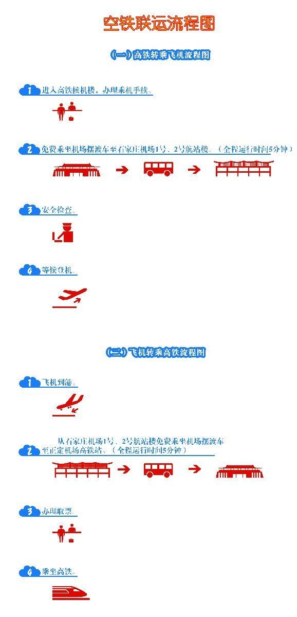 2012年12月26日,京广高铁全线贯通,石家庄机场高铁候机楼同日启运。该候机楼面积为1500平方米,旅客在此可以办理购票、值机、候机、行李托运等乘机手续,搭乘免费摆渡车3分钟直达候机楼。石家庄机场实现了高铁和航空的高效衔接。
