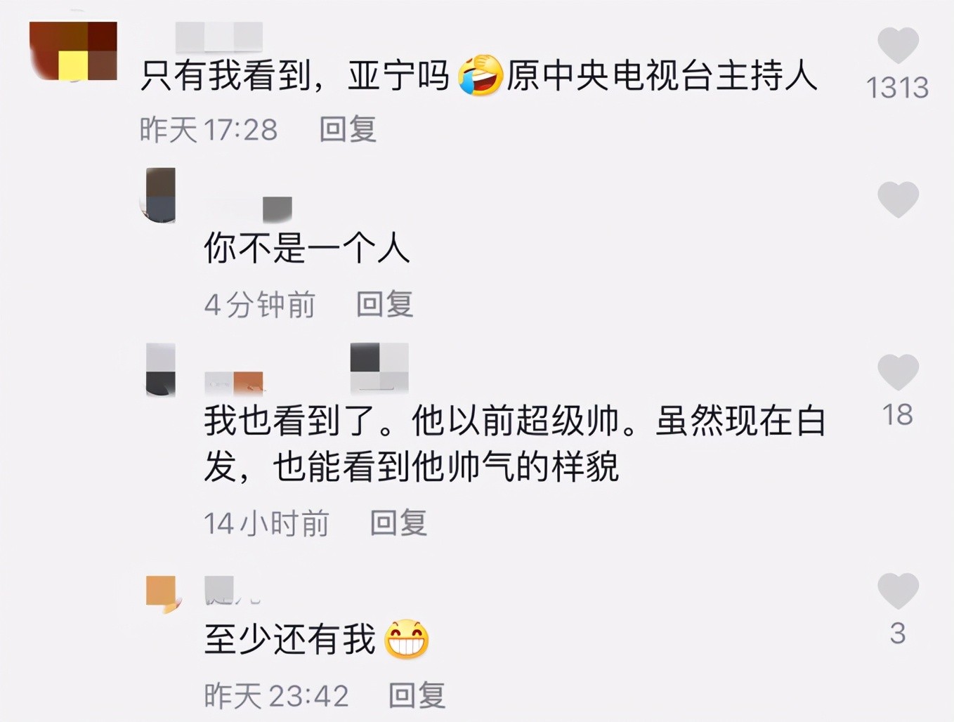 而这条视频发布后,网友们的关注点全在亚宁身上。有人评论:“只有我看到,亚宁吗?原中央电视台主持人。”还有人称:“我也看到了。他以前超级帅。虽然现在白发,也能看到他帅气的样貌。”