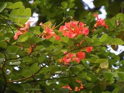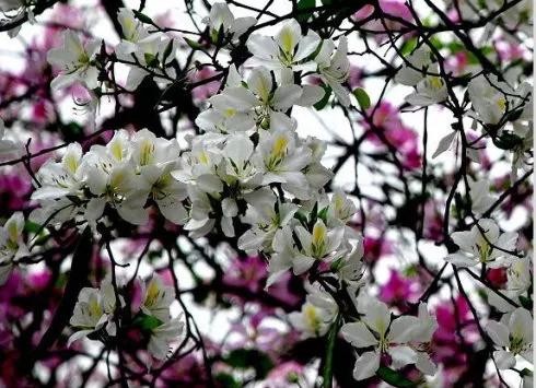 羊蹄甲树,常绿乔木,叶顶端2裂,状如羊蹄,故称羊蹄甲,花5瓣,形如兰花,又有近似兰花的清香气味,故有“兰花树”别称。