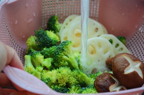 3、西兰花掰小朵,藕去皮切薄片,香菇去根切十字刀花,冲洗干净沥干水份。