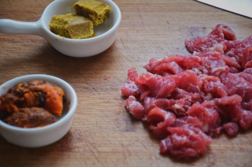 1、咖喱块1段约20克,火锅香辣底料50克,牛里脊肉150克切薄片。