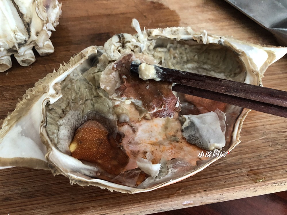 当我们剥开蟹壳,蟹胃就在蟹壳里,蟹壳里含有很多蟹黄,而蟹胃就藏身于其中。我们把蟹胃去掉,剩下的都是可以吃的部位。