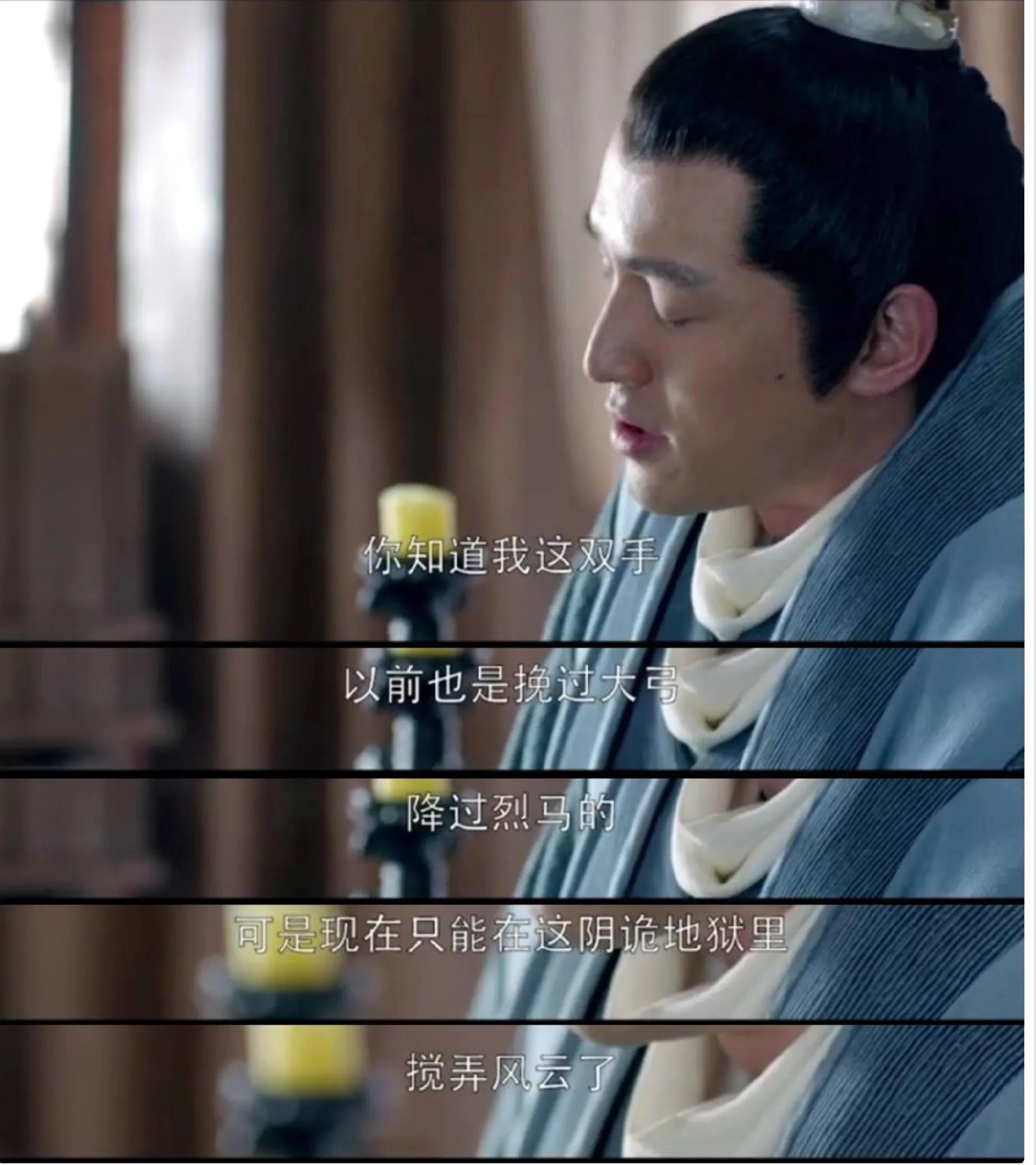 在第十一集,梅长苏的那番悲叹:你知道我这双手,以前也是挽过大弓,降过烈马的。可是现在只能在这阴诡地狱里,搅弄风云了。