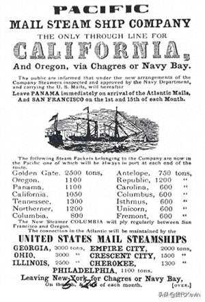 1848 年 1 月,加利福尼亚淘金热开始。同月,太平洋邮政订购了三艘轮船,并将它们命名为 SS California、SS Panama 和 SS Oregon。1848 年 10 月,SS California 从纽约市出发,开通从巴拿马到西海岸的航线,绕过合恩角到旧金山。除了邮件之外,太平洋邮政的轮船还向许多有希望的矿工出售了通道。
