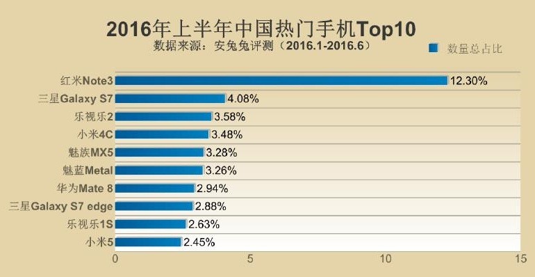 另外,2016年上半年中国大陆地区热门手机TOP10榜单中可以看出,其中的大部分位置都被小米、魅族、乐视三家给瓜分。而三星推出的两款新旗舰(三星S7/S7 edge)在国内市场也有着不错的占有率,相信这和两款手机的好口碑有着很大的关系。另外主打商务风的华为Mate 8在中国也很受欢迎。