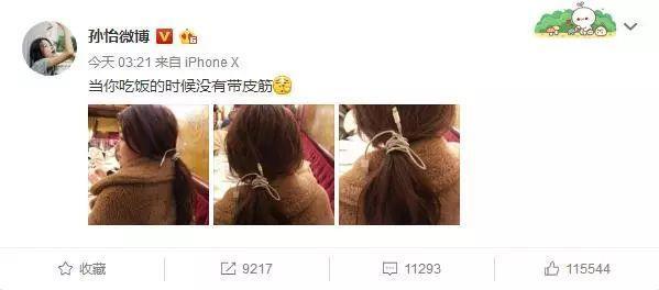孙怡发了一条微博,“当你吃饭的时候没有带皮筋