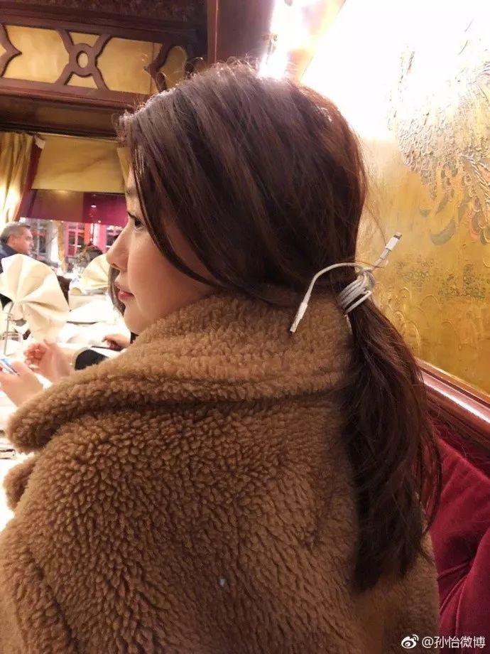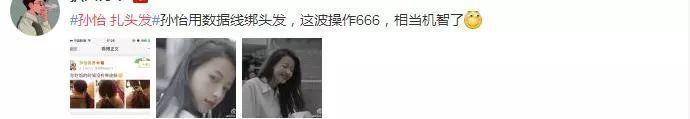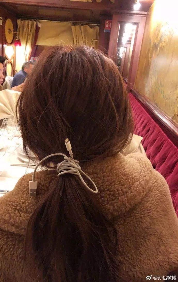 照片中,孙怡是用手机数据线缠绕数圈来绑头发,成功解决了没有带皮筋的烦恼,这波操作也是让网友大呼666。