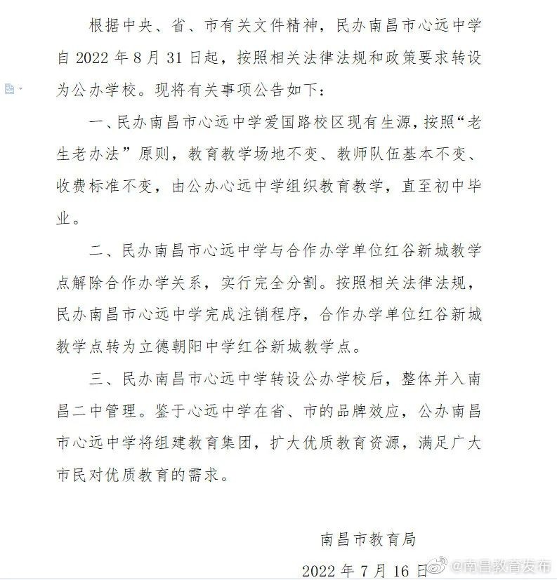 据《中华人民共和国民办教育促进法实施条例》,中共中央办公厅、国务院办公厅《关于规范民办义务教育发展的意见》,江西省委教育工作领导小组《江西省规范民办义务教育发展专项工作方案》规定,自2022年秋季学期起,南昌市西湖区小星星学校停止初中招生。此外,2022年秋季,青山湖区以下3所民办学校停止义务教育阶段招生:南昌月兔实验小学(停止小学招生)南昌市贤士学校(停止小学、初中招生)南昌九州学校(停止小学招生)