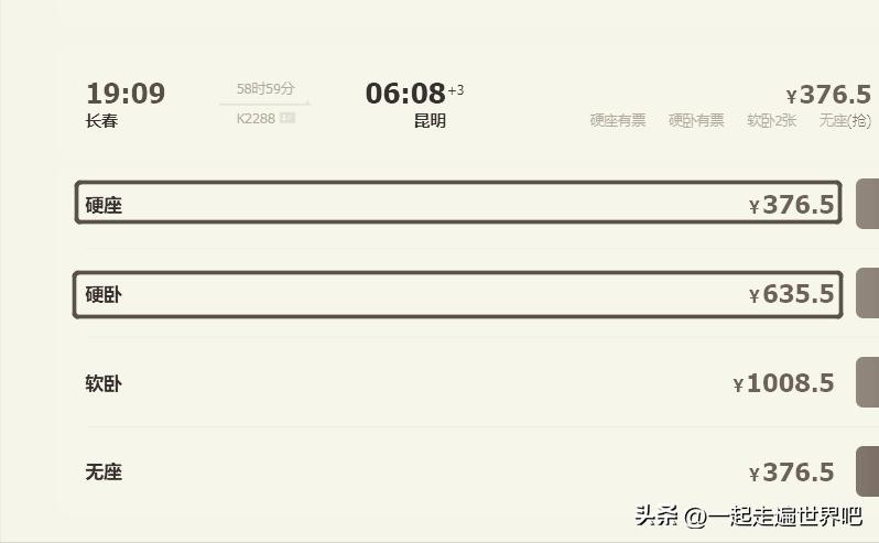 长春到昆明,如果是硬座,全程票价是376.5元,硬卧是635.5元!
