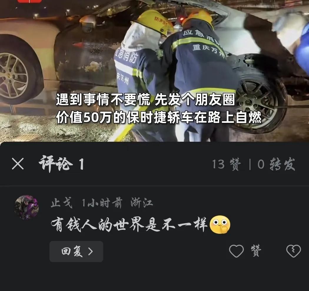 2月19日,重庆一女车主的保时捷自燃了,女车主叫了119灭火后,拿出手机拍了照发朋友圈,真真是用行动诠释了什么叫做“遇事不要慌,先发条朋友圈”。