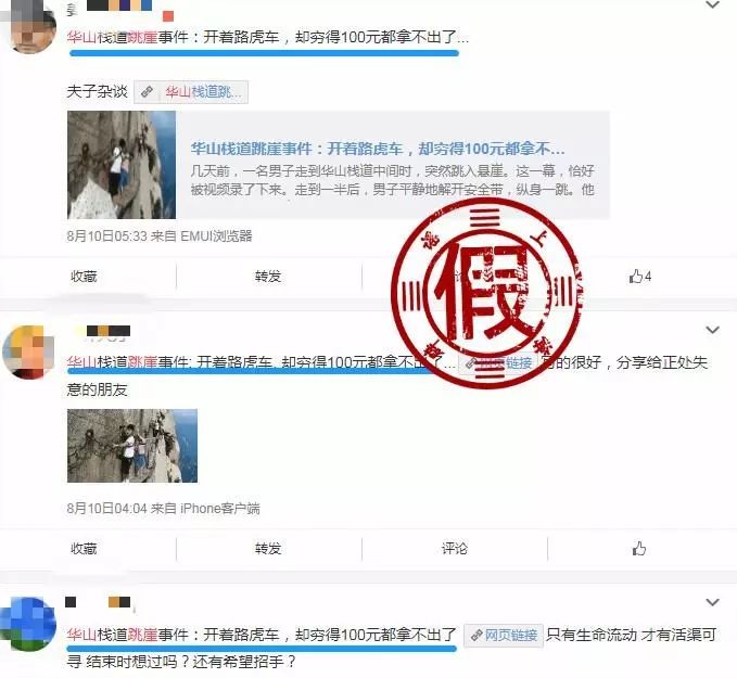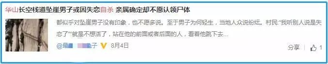 前几天,一男子在华山长空栈道解开保险绳、跃下轻生,此举令两旁正在通过栈道的游客目瞪口呆。该事件由于现场视频被发网上,迅速引起各方关注。随后,有消息称家属不肯前往认领遗体,也有传言称该男子是因穷困潦倒而跳崖,这几个消息随后都被证实是假的。对此,有网友表示:“好多自媒体就是看这种捕风捉影,甚至是虚构杜撰来吸人眼球。”