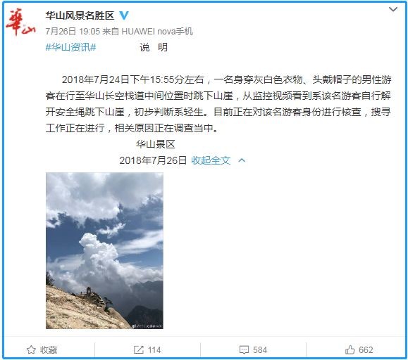 男子华山跳崖事件:家境普通,家属已将骨灰领回